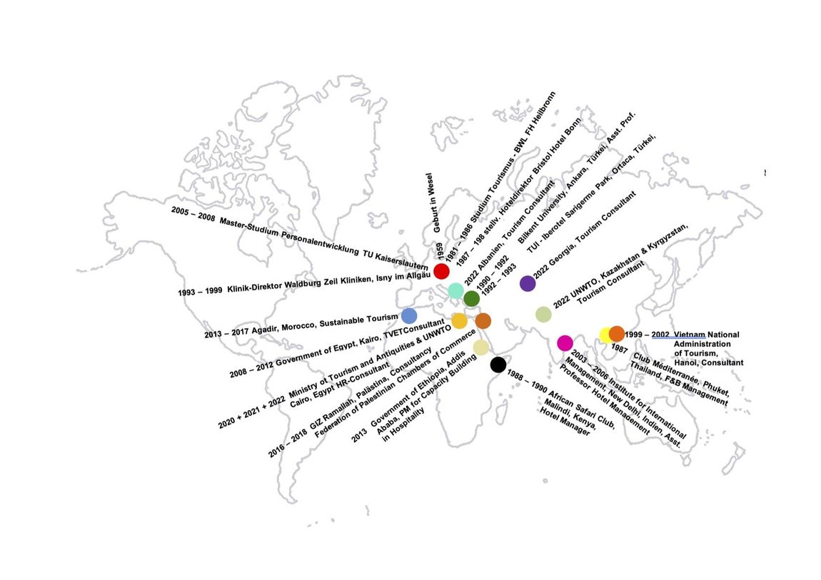Zuvor war ich u.a. in Marokko für ein Pilot-Projekt für nachhaltigen Tourismus und nachhaltiges Hotel-Management verantwortlich. In Vietnam wurde mir als erster Ausländer überhaupt der Verdienstorden des Tourismusministeriums für mein Engagement als Berater für die dortige Tourismusbehörde verliehen. Für das Institute for International Management and Technology in Delhi, Indien habe ich Studenten während ihrer Praktika in Gross-Britannien, Dubai und Abu Dabi engmaschig betreut. In Indien entstand auch das Hilfsprojekt für benachteiligte Menschen der Gesellschaft 'Maid in India' und hier wurde auch Masala Mahal kreiert, eine Gewürzbox mit Rezeptbuch.